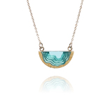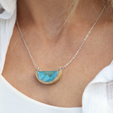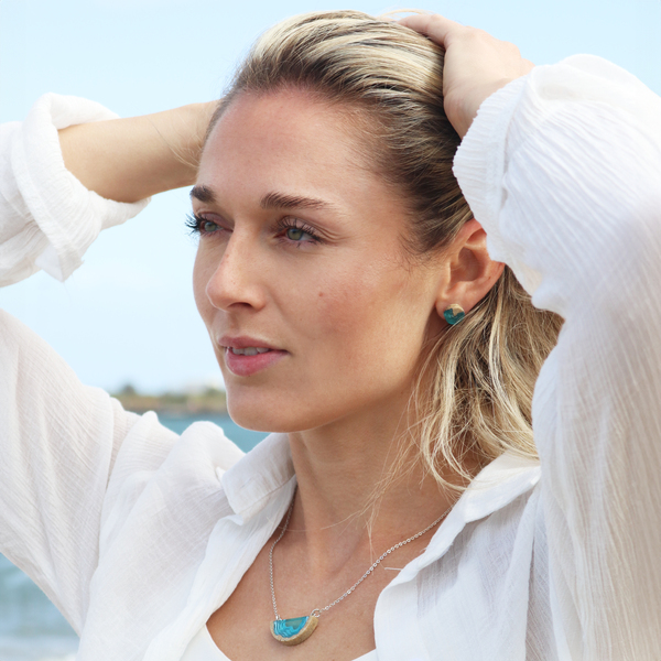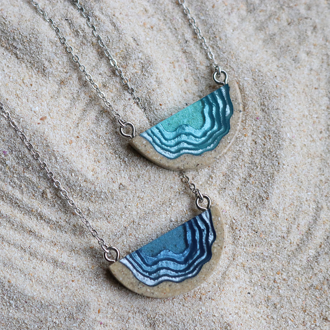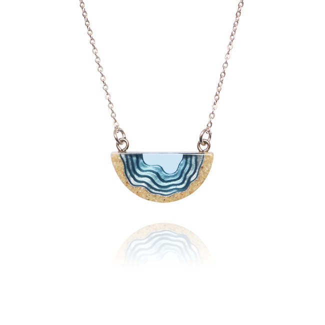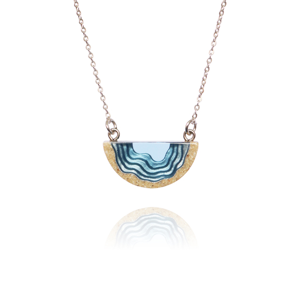 Drawing inspiration from the geographic shape of an inlet, this design showcases a small, semi-circular pendant carefully handcrafted from bonded sand, aquamarine or ultramarine blue resin and metal pigments. The pendant is elegantly connected to a 50cm/20" long fine link chain by two eye screws, complete with a 5cm/2" extender featuring our distinctive leaf-shaped tag adorned with our engraved logo.