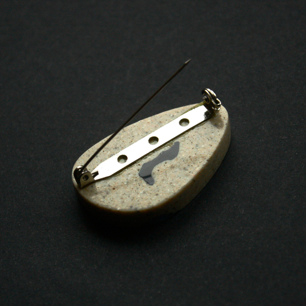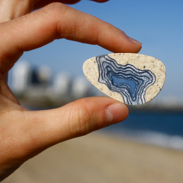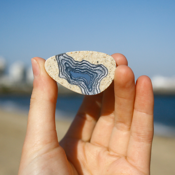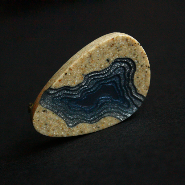 The Chasm brooch is an asymmetrically shaped jewellery piece which has been carefully handcrafted from bonded beach sand, ultramarine blue resin and metal pigments with a high-gloss polished finish. The back of the brooch features 4 cm long rhodium plated pin.