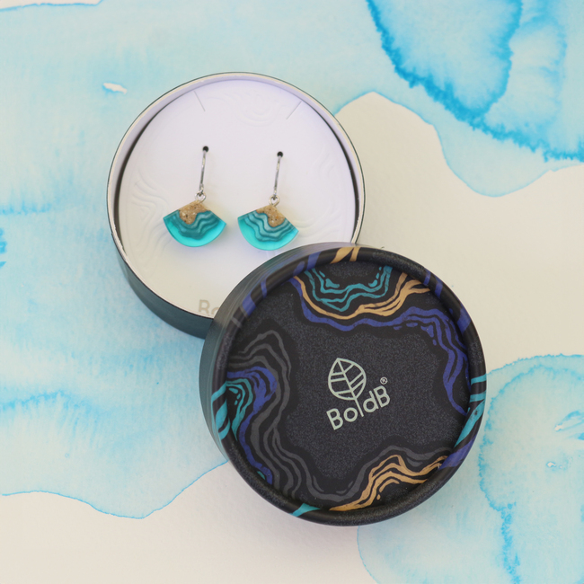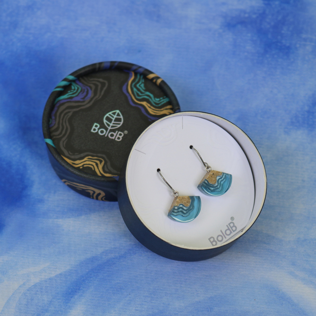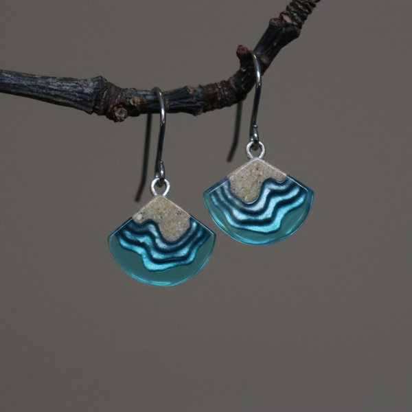 Named after coastal bents known as bights, our dainty, fan-shaped Bight earrings are the smallest dangle earrings in our Aqua range. Each earring is carefully handcrafted from bonded sand, aquamarine or ultramarine blue resin and metal pigments. Eye-pins connect these earrings to allergy-friendly stainless steel French hooks, ensuring both style and comfort.