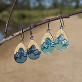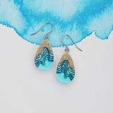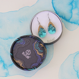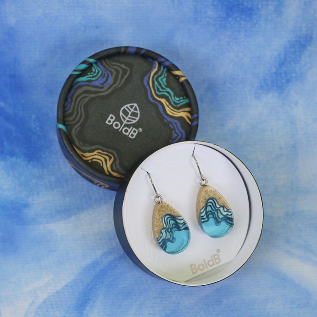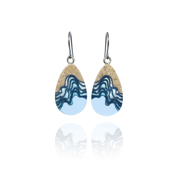Drawing inspiration from the beauty of oceanic shorelines, our Seashore Dangle Earrings are carefully handcrafted using bonded sand, aqua or ultramarine blue resin, and metal pigments. Each piece is polished to a high gloss finish for a beautiful shine. These earrings are connected to allergy-friendly stainless steel French hooks by eye pins, ensuring both style and comfort.