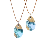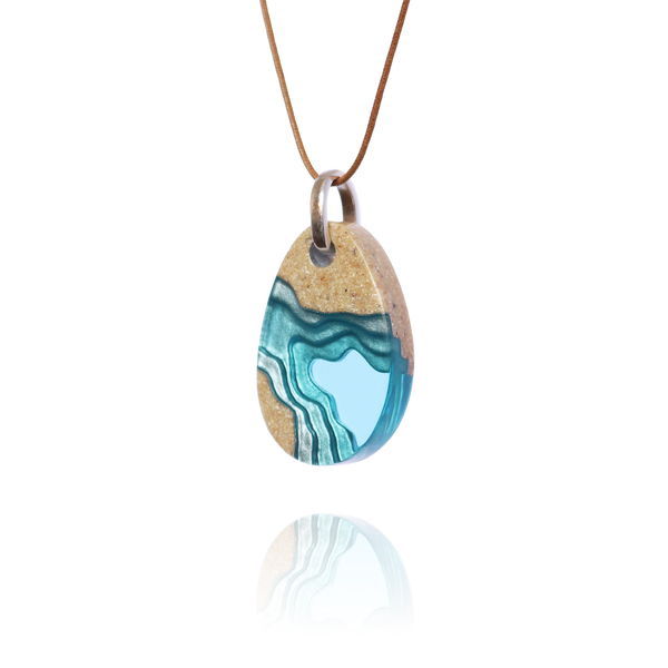 Taking inspiration from the geographic contours of a cove, this tear-drop-shaped necklace design is meticulously handcrafted from bonded beach sand, aquamarine or ultramarine blue resin, and metal pigments. The pendant is elegantly connected to its caramel brown cord by a free-swinging hook, while a sliding knot allows you to adjust the cord's length up to 30"/76cm for a perfect fit.