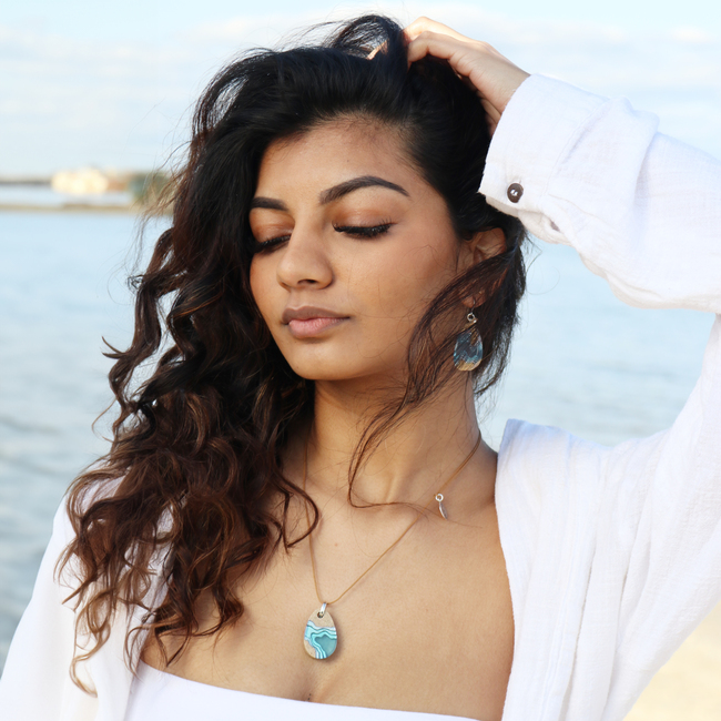 Taking inspiration from the geographic contours of a cove, this tear-drop-shaped necklace design is meticulously handcrafted from bonded beach sand, aquamarine or ultramarine blue resin, and metal pigments. The pendant is elegantly connected to its caramel brown cord by a free-swinging hook, while a sliding knot allows you to adjust the cord's length up to 30"/76cm for a perfect fit.
