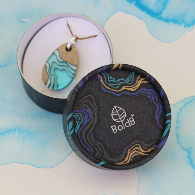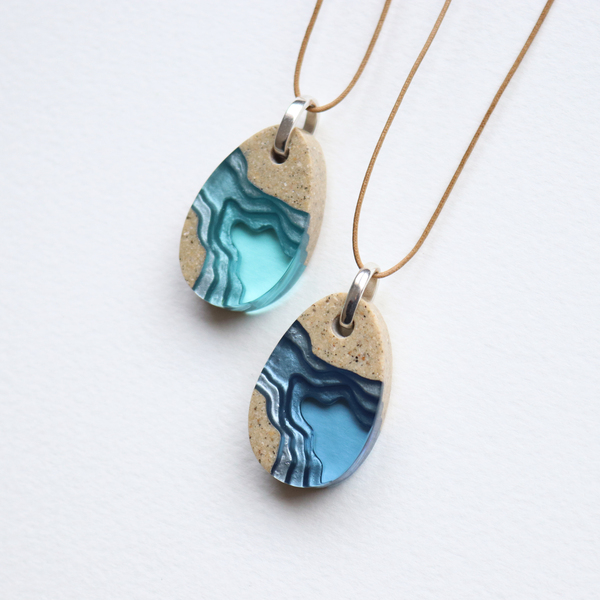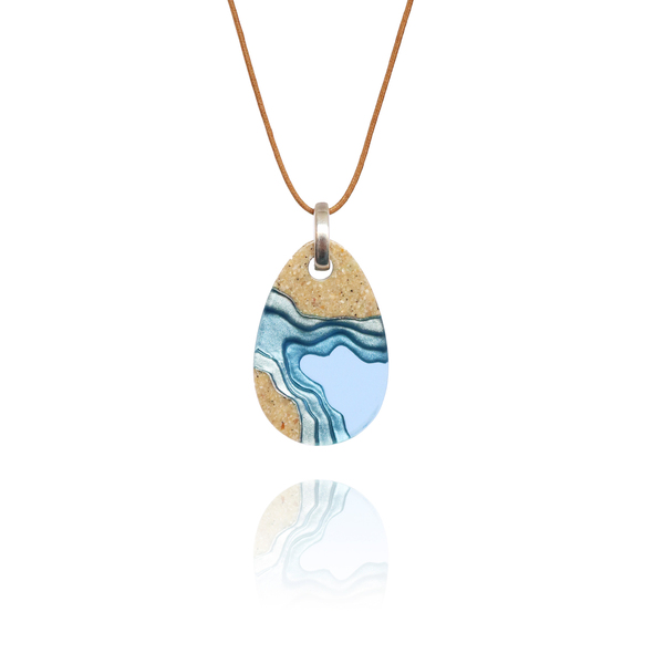 Taking inspiration from the geographic contours of a cove, this tear-drop-shaped necklace design is meticulously handcrafted from bonded beach sand, aquamarine or ultramarine blue resin, and metal pigments. The pendant is elegantly connected to its caramel brown cord by a free-swinging hook, while a sliding knot allows you to adjust the cord's length up to 30"/76cm for a perfect fit.