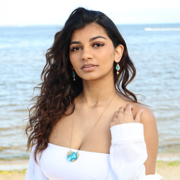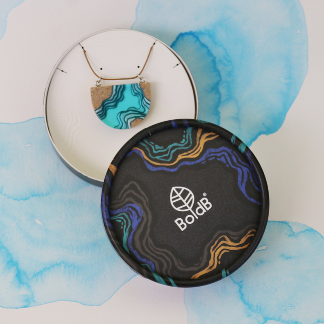 Our Waterway Necklace has been carefully handmade from bonded sand, aqua blue resin and metal pigments with a high-gloss polished finish. Two eye screws together with two jumps rings connect the pendant to its caramel brown cord. The cord has a sliding knot to adjust its length.