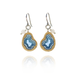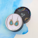 Our Basin earrings showcase an asymmetrical teardrop shape, with bonded sand encasing blue resin. Inspired by oceanic basins, the design echoes their natural form, reflecting the beauty of the sea. Each earring dangles on an allergy-friendly French ear hook and embellished with a translucent agate gemstone.