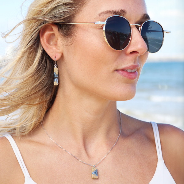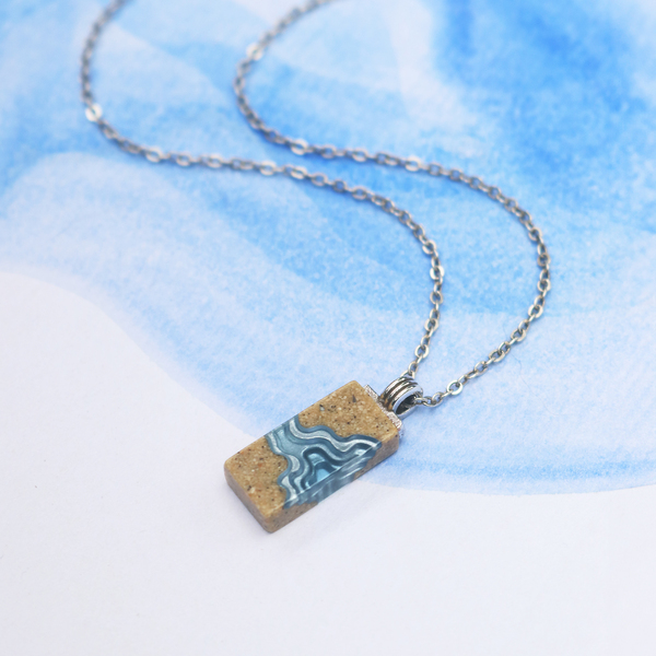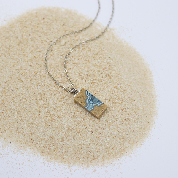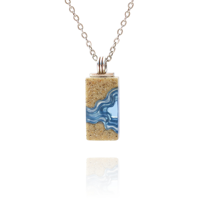 Our Delta necklace showcases a minimalist rectangle design, with layers that mimic the topography of a river mouth meeting the ocean, inspiring its name. The necklace is carefully crafted from bonded beach sand and blue resin and dangles on an 18”/45cm cable link chain with a 2”/5cm extender.