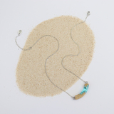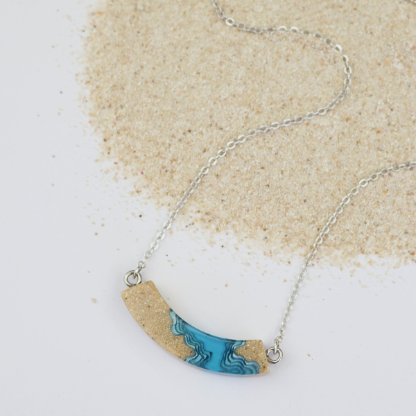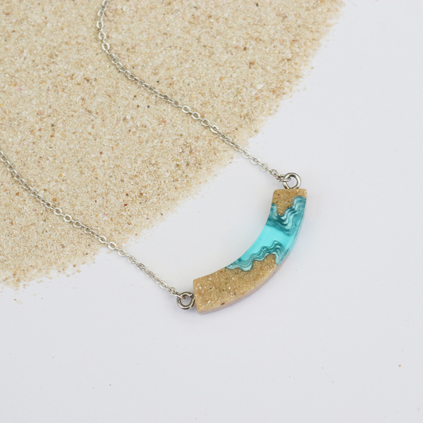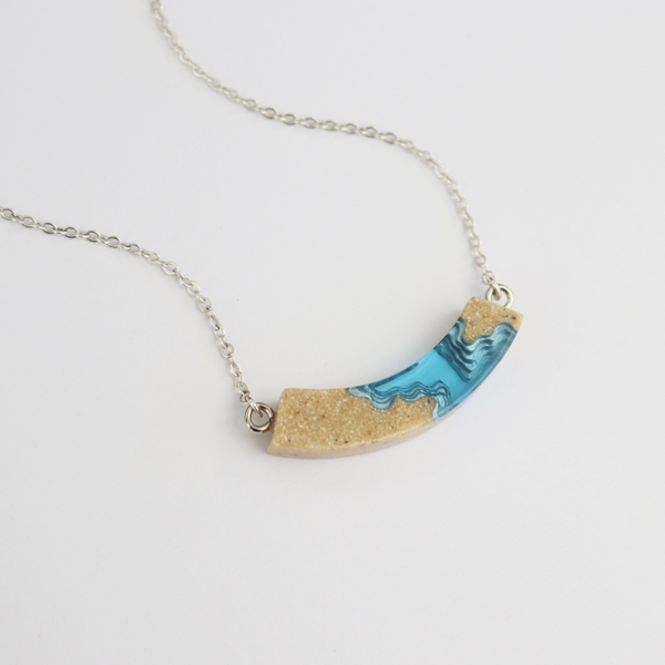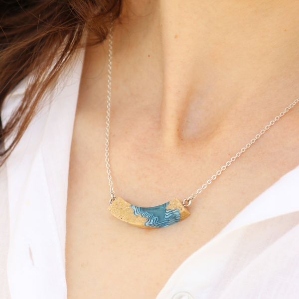 Our Headland necklace features a bold, slightly arched design with layered textures that evoke the topography of two land masses jutting into the ocean. Crafted from bonded beach sand and blue resin, the pendant hangs from a 16”/40cm cable link chain, complete with a 2”/5cm extender for an adjustable fit.