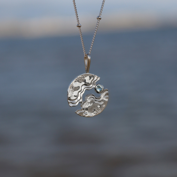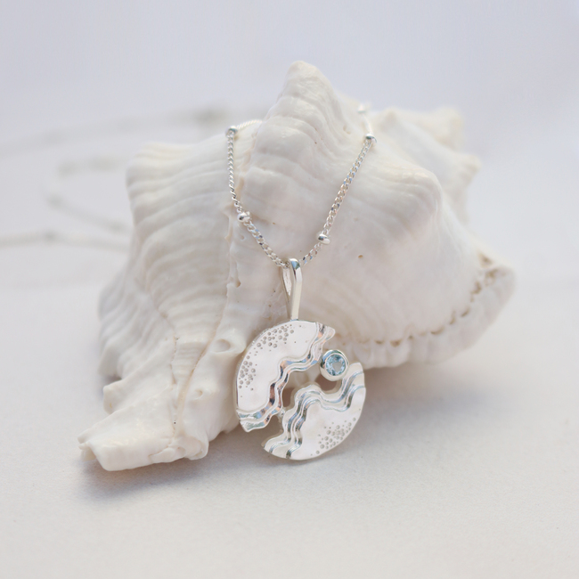 The Serenity Collection draws inspiration from the serene beauty of the ocean and its shores. Our Hideaway necklace has been carefully crafted by Balinese silversmiths from environmentally friendly recycled 925 sterling silver. A beautiful light blue Topaz gemstone aims to resemble the shimmering essence of water.