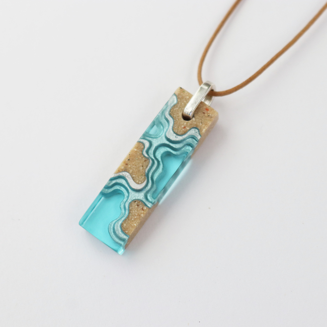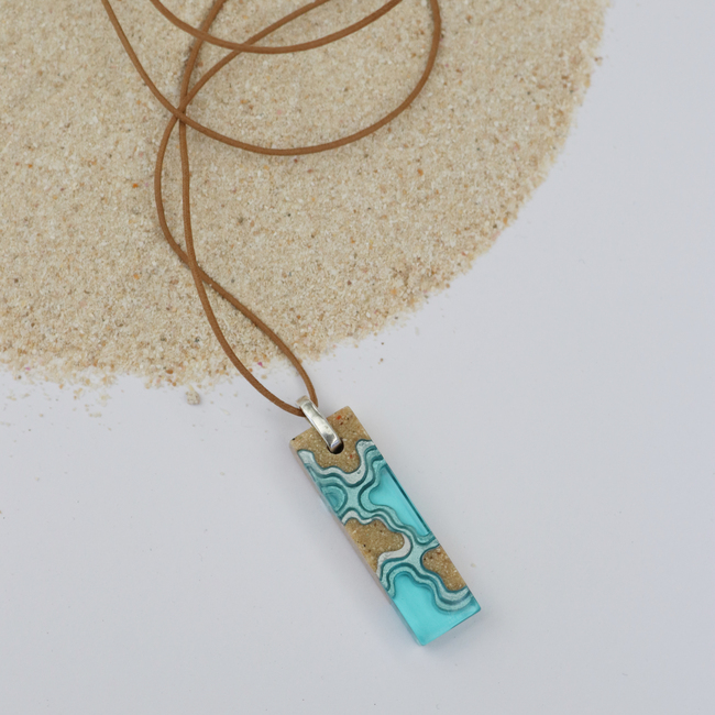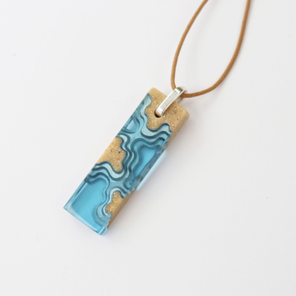 Our Islands necklace showcases a long rectangular pendant with layered textures that evoke the topography of three nearby islands, inspiring its name. Made from bonded beach sand and blue resin, the pendant is suspended on a handcrafted hook, attached to a caramel brown cord with a sliding knot for adjustable length. The cord can be extended up to a maximum length of 28”/70cm.