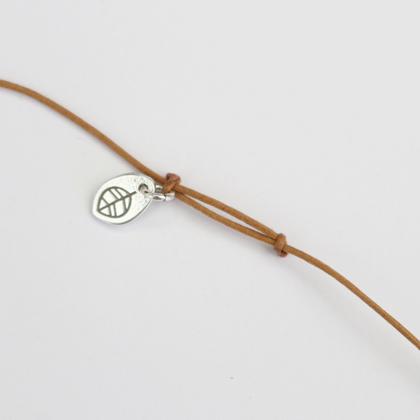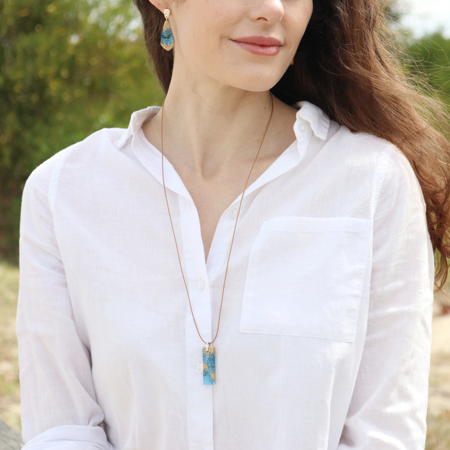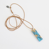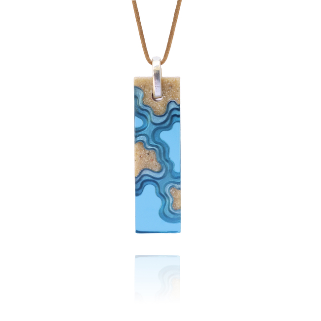 Our Islands necklace showcases a long rectangular pendant with layered textures that evoke the topography of three nearby islands, inspiring its name. Made from bonded beach sand and blue resin, the pendant is suspended on a handcrafted hook, attached to a caramel brown cord with a sliding knot for adjustable length. The cord can be extended up to a maximum length of 28”/70cm.