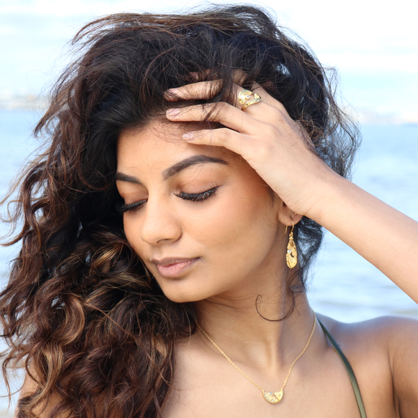 The Serenity Collection draws inspiration from the serene beauty of the ocean and its shores. Our Paradise necklace has been carefully crafted by Balinese silversmiths from environmentally friendly recycled 925 sterling silver with 18K gold plating. The design features a beautiful light blue Topaz gemstone, evoking the shimmering essence of water.