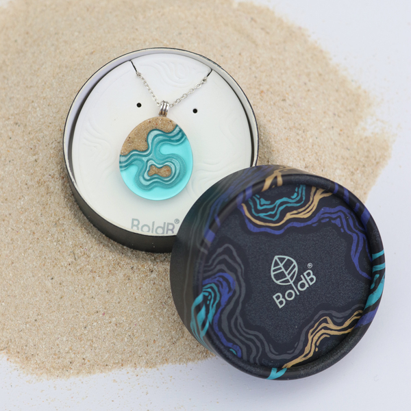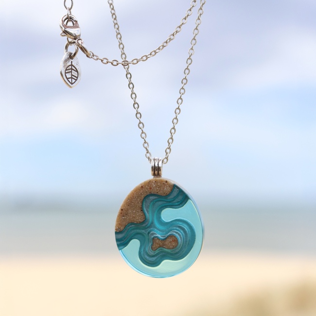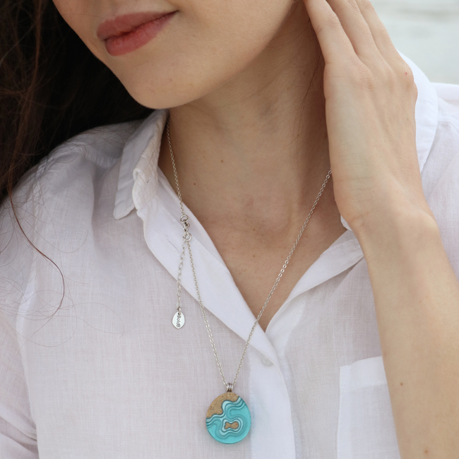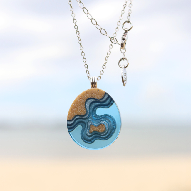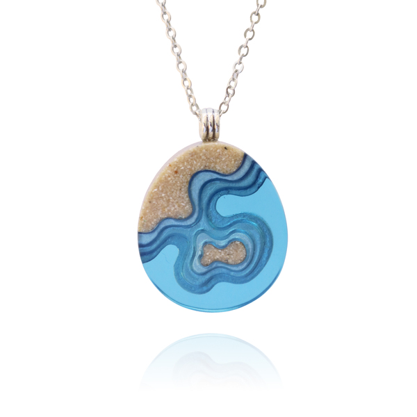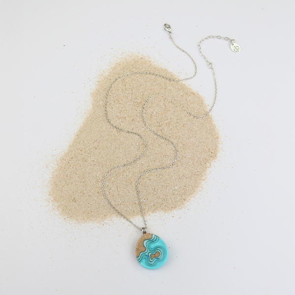 Our Promontory necklace showcases a wide tear drop shaped design, with layers that mimic the topography of a Promontory pertruding into the ocean. The necklace is carefully crafted from bonded beach sand and blue resin and dangles on an 20”/50cm cable link chain with a 2”/5cm extender.