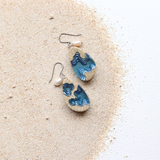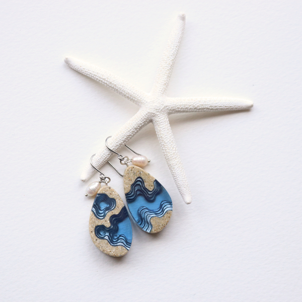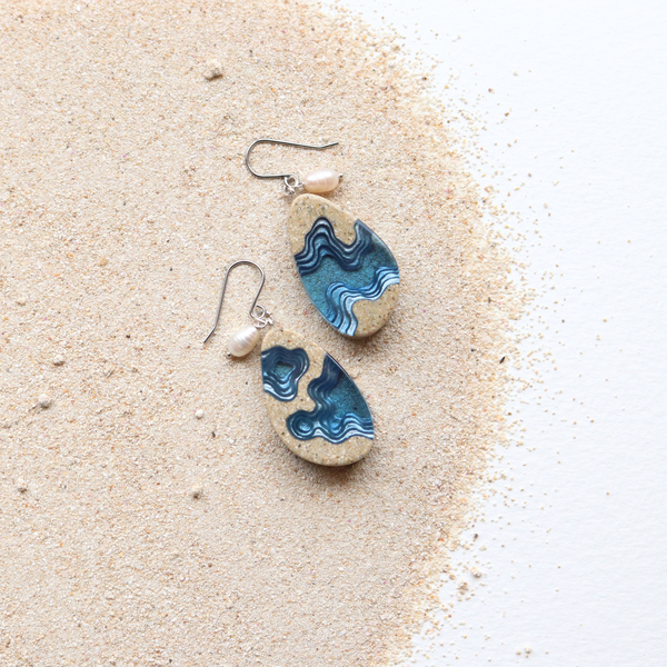The Rockpool earrings are the largest earrings from our Aqua collection and ideal for those who love to make a statement. They feature a unique asymmetrical tear drop shape and have been crafted from bonded sand, blue resin and silver metal pigments covering the delicate topographic layers of the earrings. Each earring features a delicate freshwater pearl with a beautiful slightly peach pink luster. The ear hooks are made from allergy friendly stainless steel.