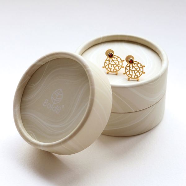 Our Roseni Stud Earrings have been named after the coral species Acropora Roseni and feature a compact round shape with branching coral patterns and a 3mm natural rich red garnet stone. Delicate metal balls decorate the boundary of the design. The ear studs have been crafted from sustainable recycled 925 sterling silver and 18K gold plated before being carefully hand bushed to an elegant matte surface finish.