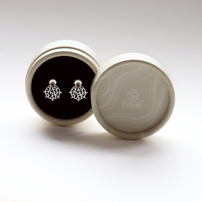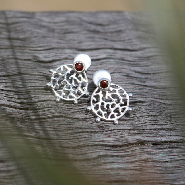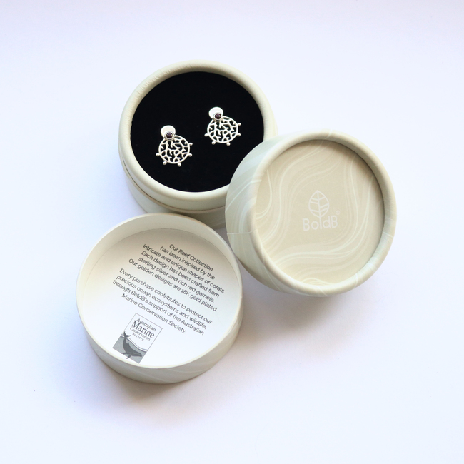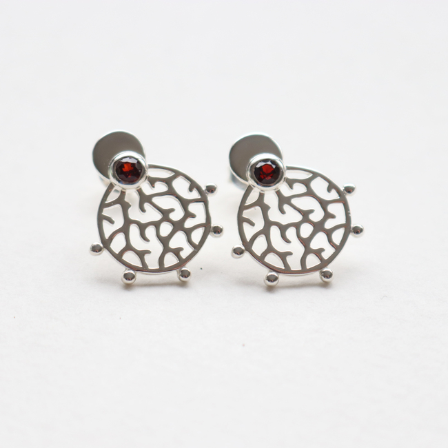 Our Roseni Stud Earrings have been named after the coral species Acropora Roseni and feature a compact round shape with branching coral patterns and a 3mm natural rich red garnet stone. Delicate metal balls decorate the boundary of the design. The ear studs have been crafted from sustainable recycled 925 sterling silver and polished to a shiny finish.