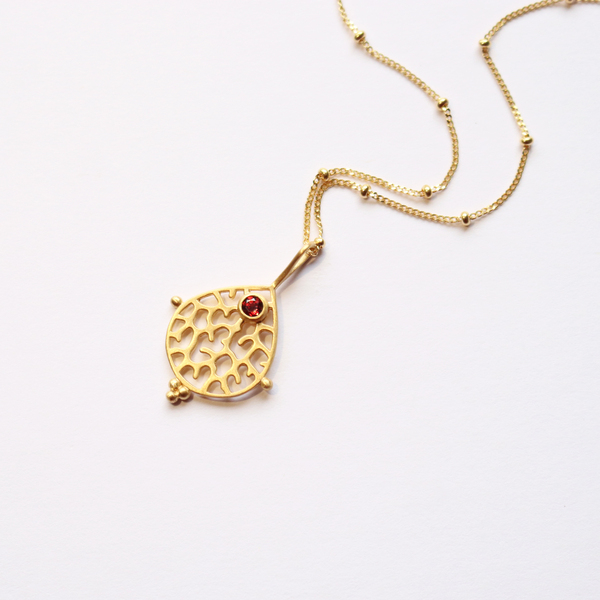 Our Selago Necklace has been named after the coral species Acropora Selago. The design features a 3mm natural rich red garnet stone and branching coral pattern with delicate metal balls decorating the tear drop shaped boundary of the pendant. The pendant has been carefully hand brushed to an elegant matte finish. The pendant rests on a 44cm long delicate polished cable link chain featuring small metal balls and a 5cm chain extender featuring our logo. The pendant and chain have been crafted from sustainable recycled 925 sterling silver and 18K gold plated.
