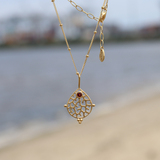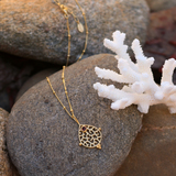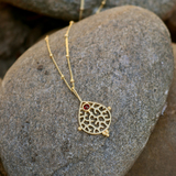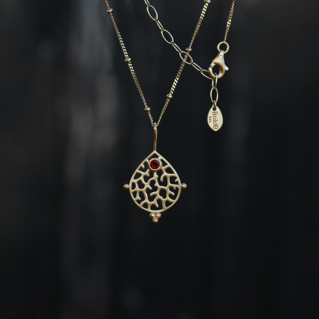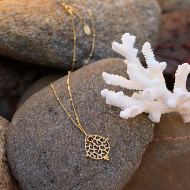Our Selago Necklace has been named after the coral species Acropora Selago. The design features a 3mm natural rich red garnet stone and branching coral pattern with delicate metal balls decorating the tear drop shaped boundary of the pendant. The pendant has been carefully hand brushed to an elegant matte finish. The pendant rests on a 44cm long delicate polished cable link chain featuring small metal balls and a 5cm chain extender featuring our logo. The pendant and chain have been crafted from sustainable recycled 925 sterling silver and 18K gold plated.
