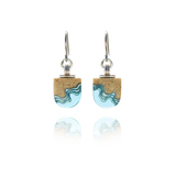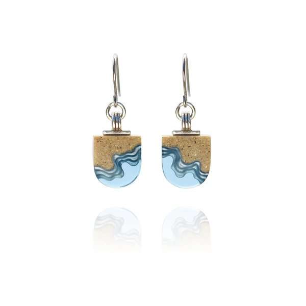 Our dainty Shoreline earrings feature a U-shaped design crafted from bonded sand and blue resin, resembling the shore and ocean. The earrings dangle on allergy-friendly stainless steel French ear hooks.