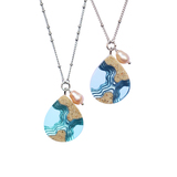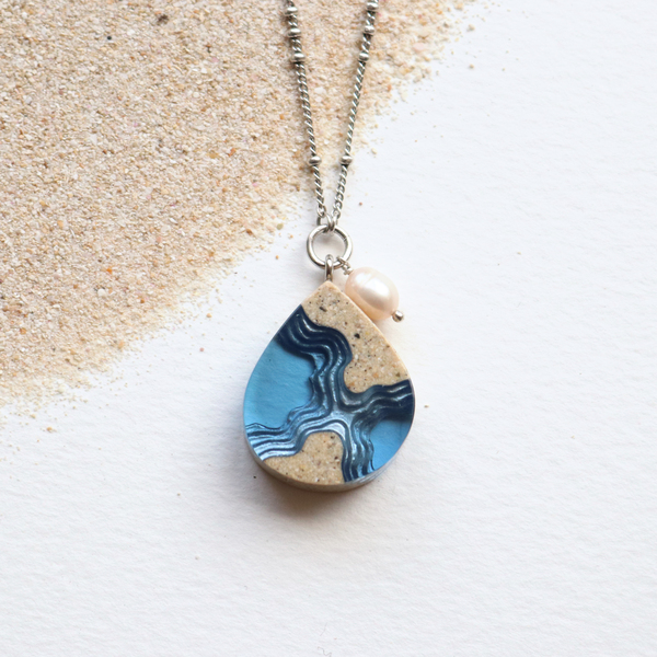 Our Tombolo Necklace features a tear drop shape and has been handcrafted from bonded sand, aqua or ultramarine blue resin and metal pigments with a high-gloss polished finish. A delicate freshwater pearl with a slightly peachy-pink luster compliments the design. The pendant rests on a delicate 65 cm long cable link chain featuring small metal balls. A 5 cm extender with our leaf logo enables you to adjust the length of the chain.